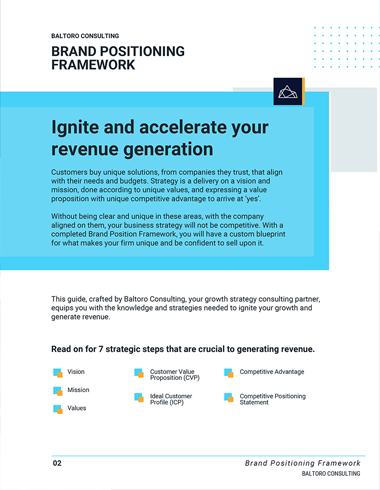 With a completed Brand Position Framework, you will have a custom blueprint for what makes your firm unique and be confident to sell upon it. Know your uniqueness, why your customers should care, and how to articulate it to get to “yes.”